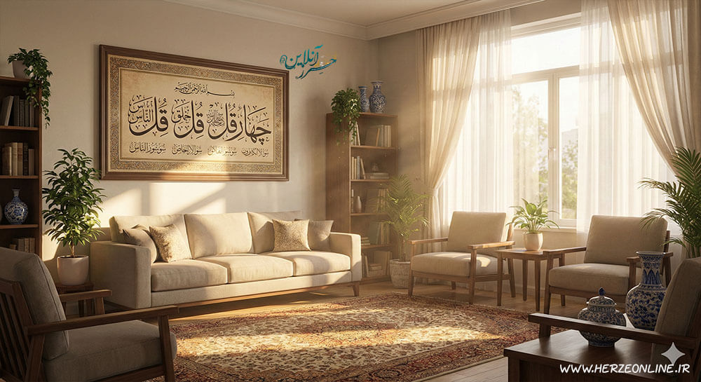 نصب تابلوی چهار قل (بهویژه اگر روی پوست آهو یا متریال طبیعی باشد) در ورودی منزل یا اتاق نشیمن، باعث میشود انرژیهای منفیِ مهمانان یا محیط بیرون، اجازه ورود به حریم امن خانه شما را پیدا نکنند.